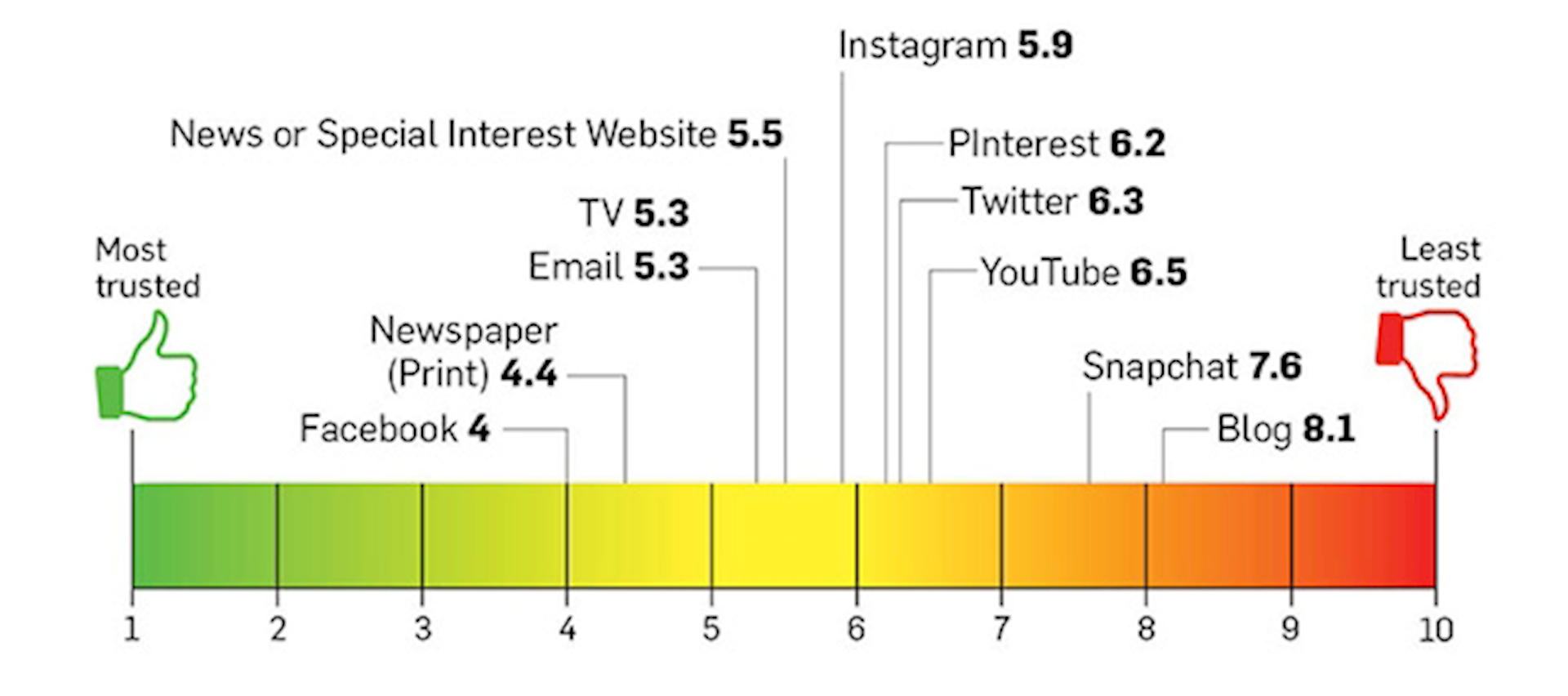 Vi har högst förtroende för Facebook, följt av tryckta tidningar, tv och e-post. Lägst förtroende har vi för det som sägs på bloggar, Snapchat och YouTube.